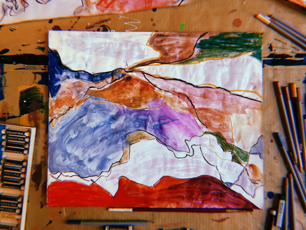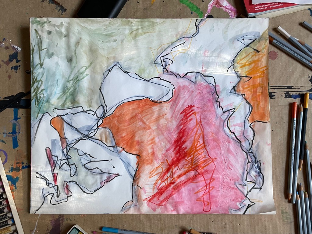 acrylic, oil pastel, pencil, watercolor
